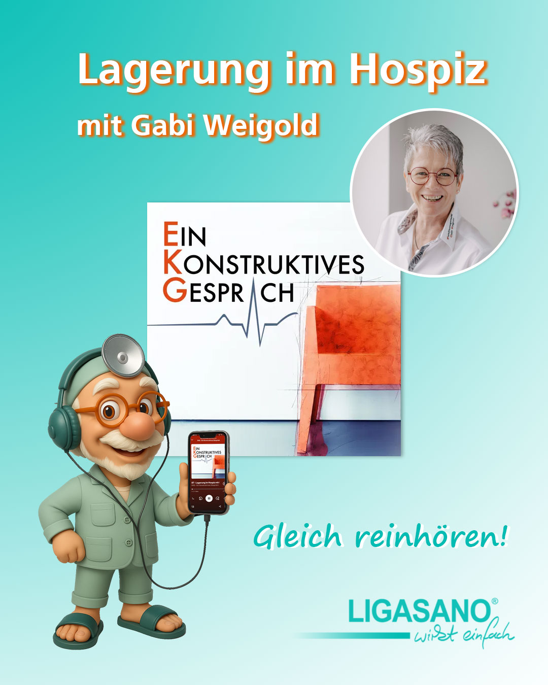 Dass im Hospiz manches etwas anders läuft und das auch gut so ist, bringt Wundmanagerin und Palliativ-Fachkraft Gabi Weigold in der neuen Podcast-Folge „Lagerung im Hospiz“ von "EKG - Ein Konstruktives Gespräch" klar zum Ausdruck. Wenn eine kurative Behandlung nicht länger im Vordergrund steht, kann der Patient mit seinen aktuellen Bedürfnissen und Wünschen stärker in den Fokus rücken. Da Folgeschäden nicht (mehr) vermieden werden müssen, ist eine fehlende Lagerung bzw. Positionierung, beispielsweise bei Übelkeit, akzeptiert. Der Patient nimmt im Endstadium sein Recht an, nicht mehr gelagert zu werden. Inwieweit sich das auf die Druckentlastung bzw. Wundbehandlung von Hospiz-Gästen auswirkt und warum Gabi mit LIGASANO® arbeitet, erfahrt ihr in ihrem Gespräch mit Carsten und Christian.
