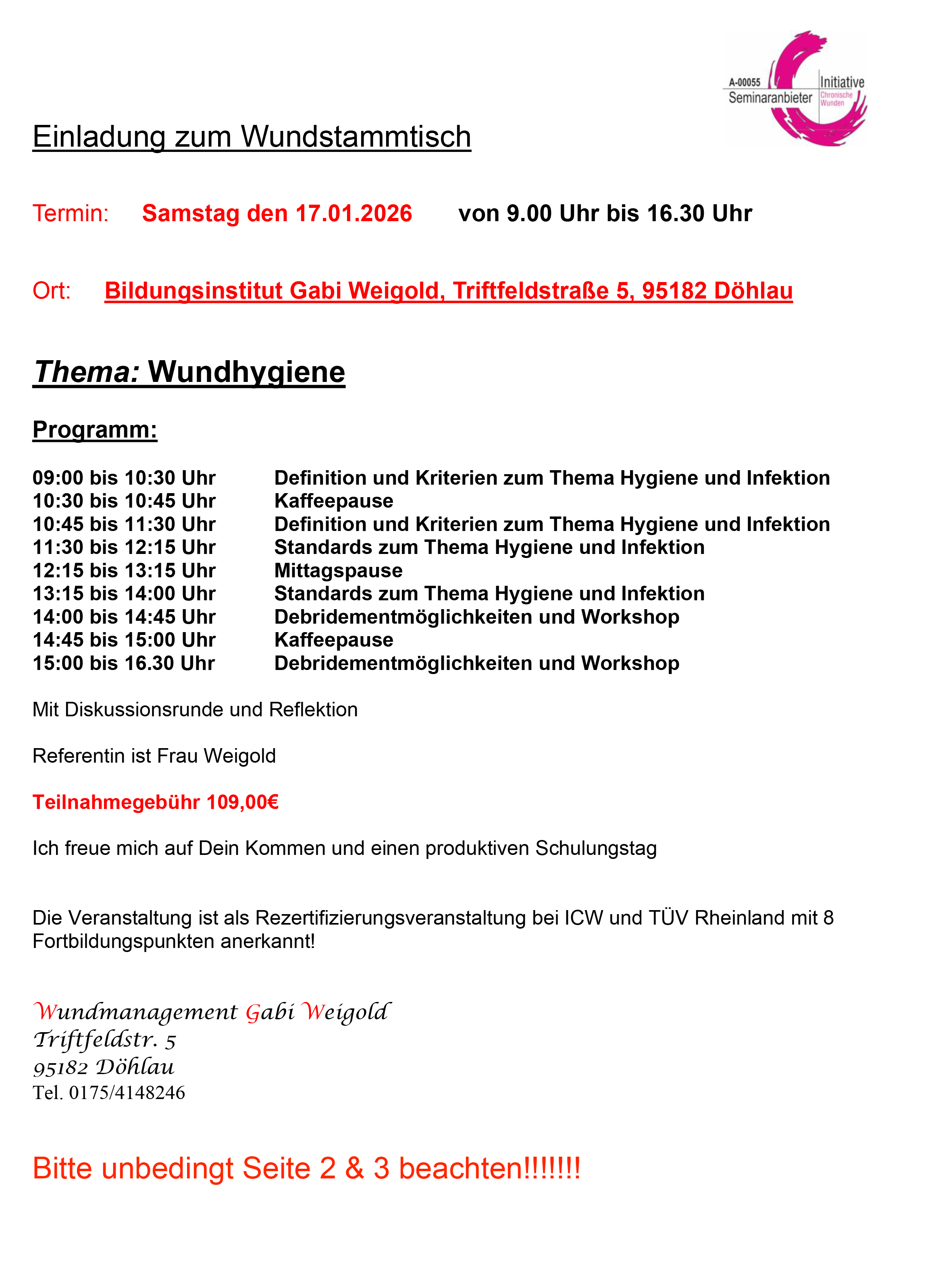 Das Bildungsinstitut Gabi Weigold bietet in den eigenen Schulungsräumen auch hierzu die Möglichkeit der sogenannten Rezertifizierung an. Termine und Informationen können dazu auf der Homepage von Wundmanagement Gabi Weigold abgerufen werden.